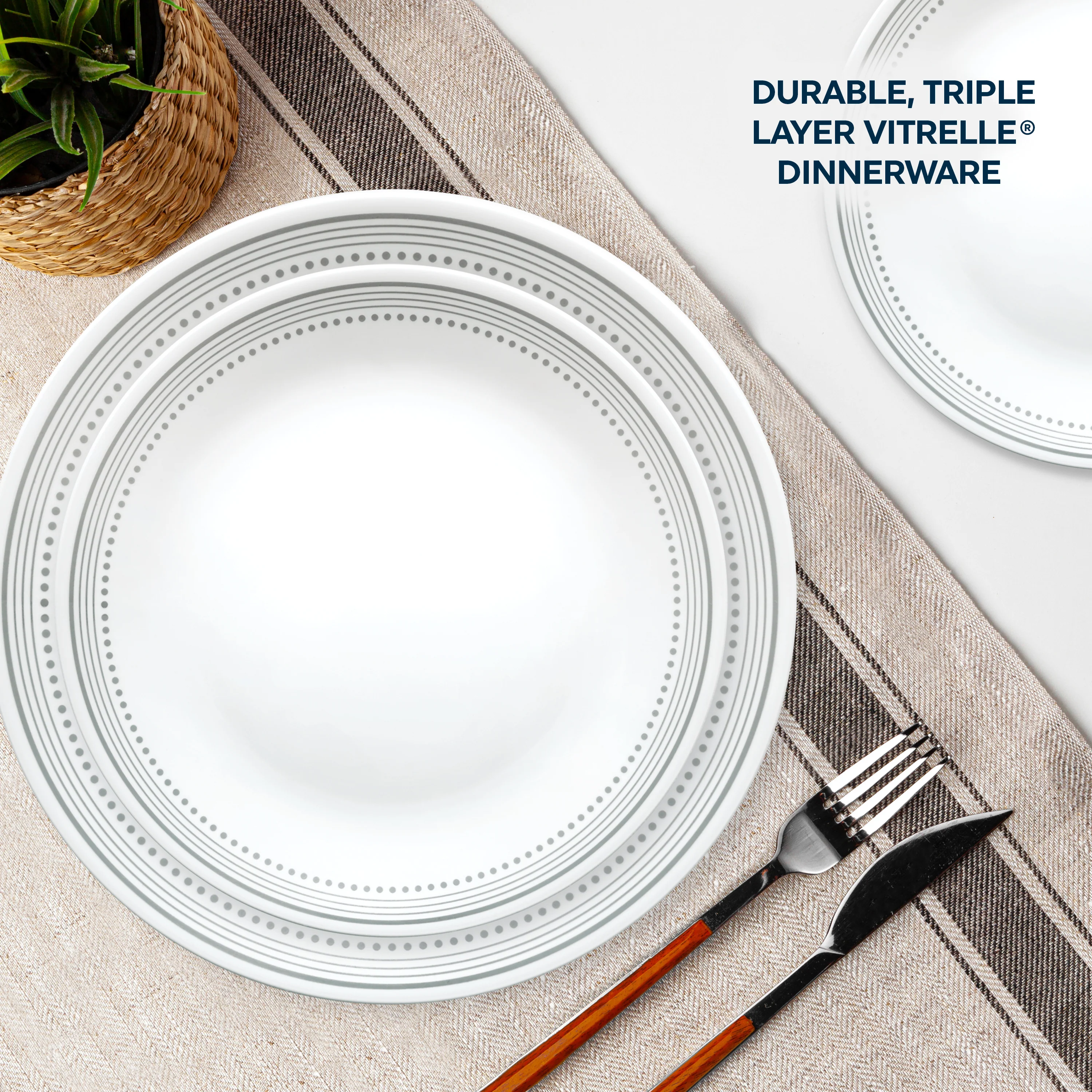 Accented with dove-gray bands and dots, this dinnerware set balances classic style with effortless panache.